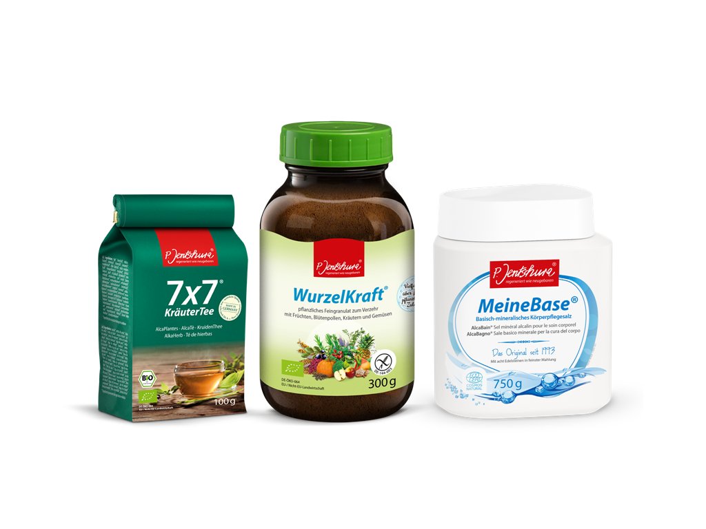 Úspešný plán pre odkyslenie • denne vypiť 1-2 šálky čaju 7x7 KräuterTee, množstvo stupňujte až na 0,5-1 liter • denne vypite 1-1,5 l neperlivej vody • zjedzte 3 a viac kávových lyžičiek WurzelKraftu počas dňa • intenzívna zásaditá starostlivosť o telo s MeineBase s pH 8,5 - kúpele celého tela a kúpele chodidiel, zásadité pančuchy, návleky, zábaly atď., tak často, ako je to len možné. |