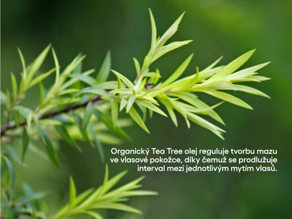 Tea Tree šampón je určený na mastné vlasy. Obsahuje Tea tree olej, ktorý podporuje ochranu proti kožnému mazu a zároveň má antimikrobiálne, antifungálne a antiseptické vlastnosti. Zároveň účinne a šetrne vyčistí vaše vlasy i pokožku a dodá im krásny objem a lesk. Výborne pôsobí tiež na ďalšie kožné problémy, ako sú pupienky, vyrážky, folikulitída, alebo lupiny. Pridaný rozmarín pokožku krásne upokojí. Šampón je vyrábaný ručne z vysoko kvalitných organických rastlinných olejov a spracovaný za studena, vďaka tomu je nabitý prírodným glycerínom, čo je luxusný spôsob, ako zvlhčiť pokožku hlavy i vlasy. Obsahuje tiež mnoho prírodných liečivých látok, ako sú bylinky, bobule, íly a soli.